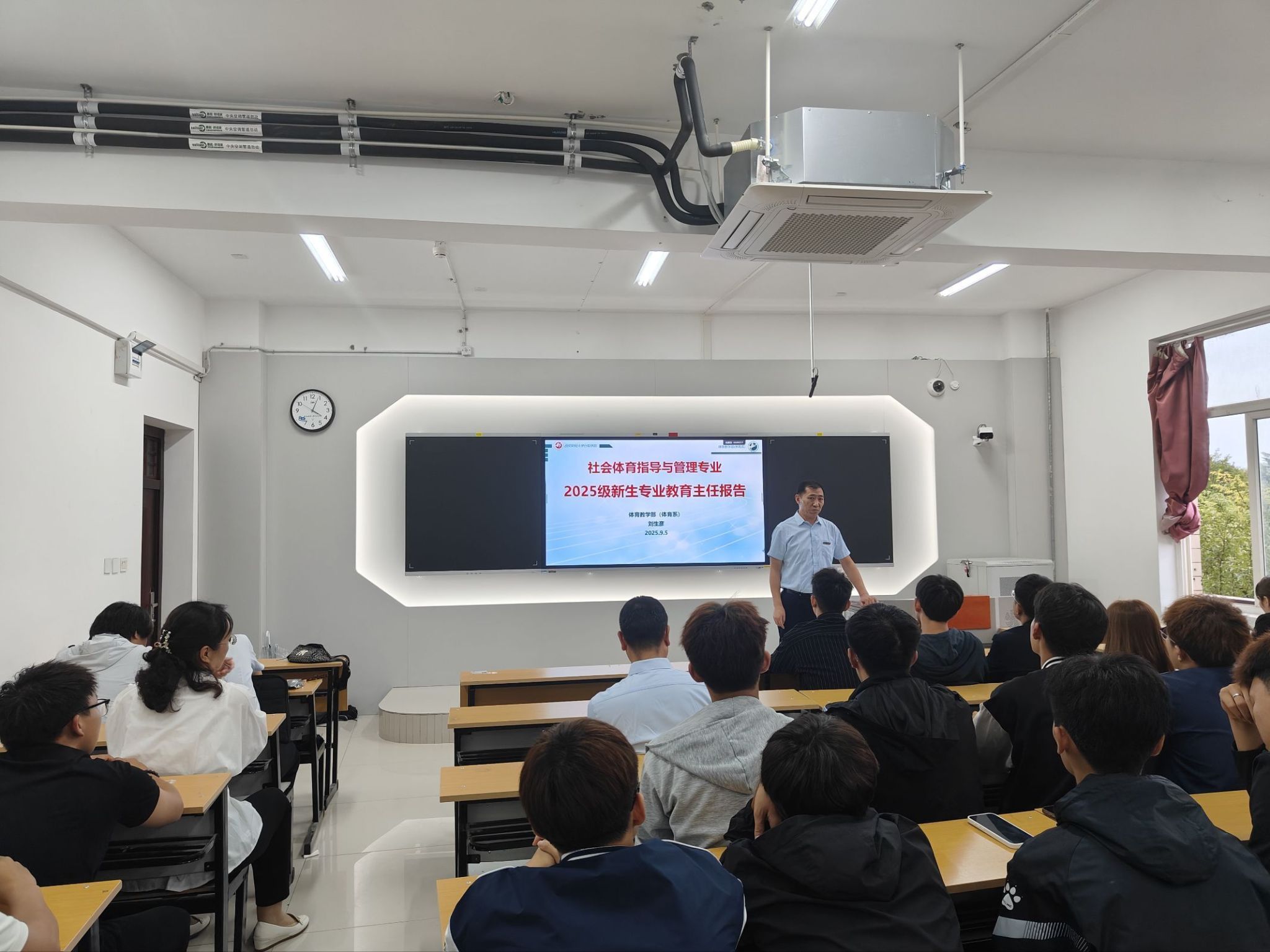 金秋送爽,丹桂飘香。为使新生尽快了解专业、融入大学生活,2025年9月5日下午,西安财经大学行知学院体育系于2222教室,隆重举行了社会体育指导与管理专业2025级新生师生见面会暨专业教育大会。体育教学部主任刘生彦、体育系主任徐桂兰及体育教学部全体教师与2025级全体新生共同出席了本次大会。