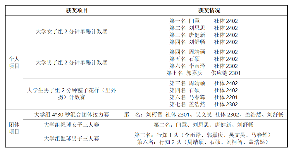 毽球队教练员冀琳、穆禹辰带领12名运动员,参与六个项目的竞技。队员们不畏强手,在比赛中展现出精湛的技艺和良好的体育风尚。经过激烈角逐,最终在比赛中斩获佳绩。获奖名单如下:
